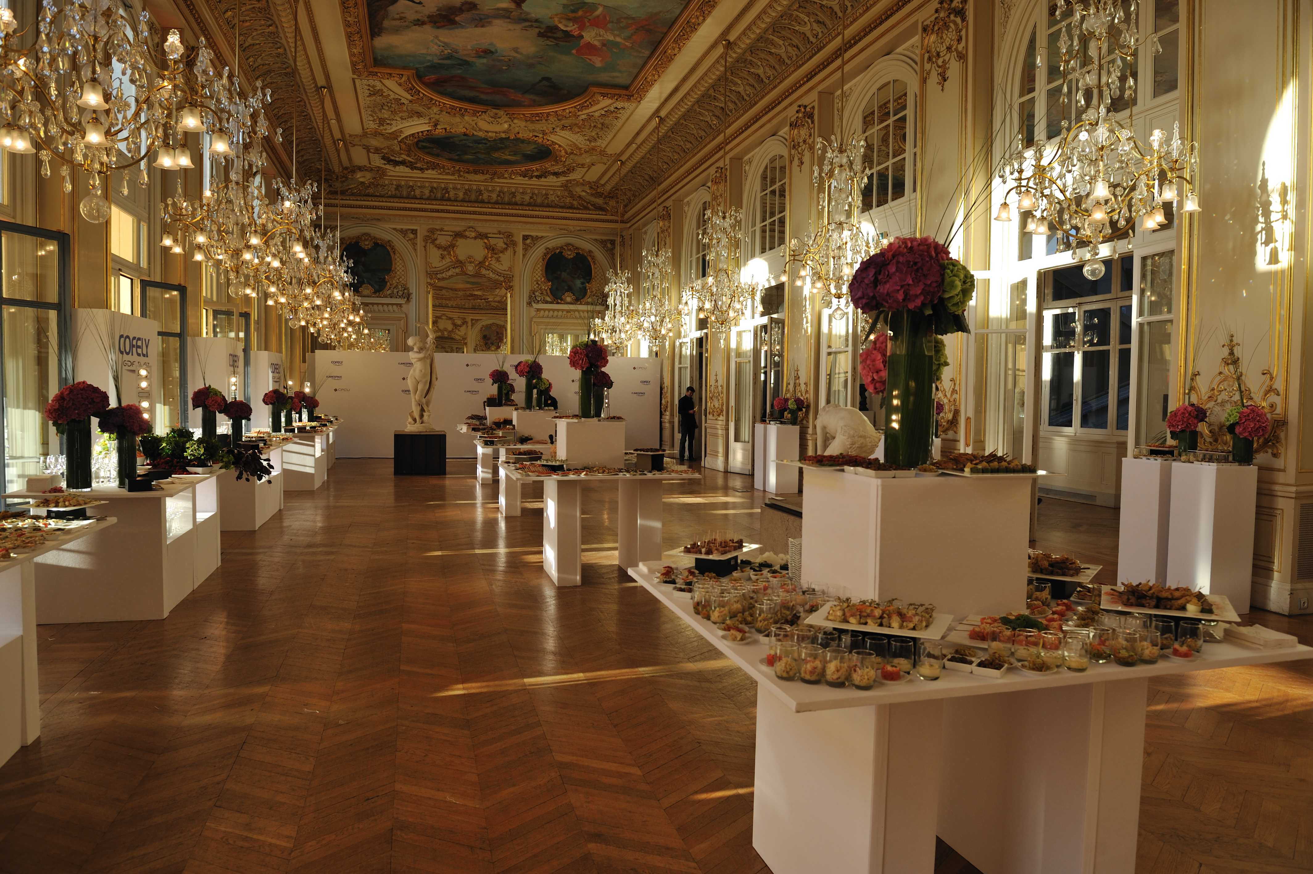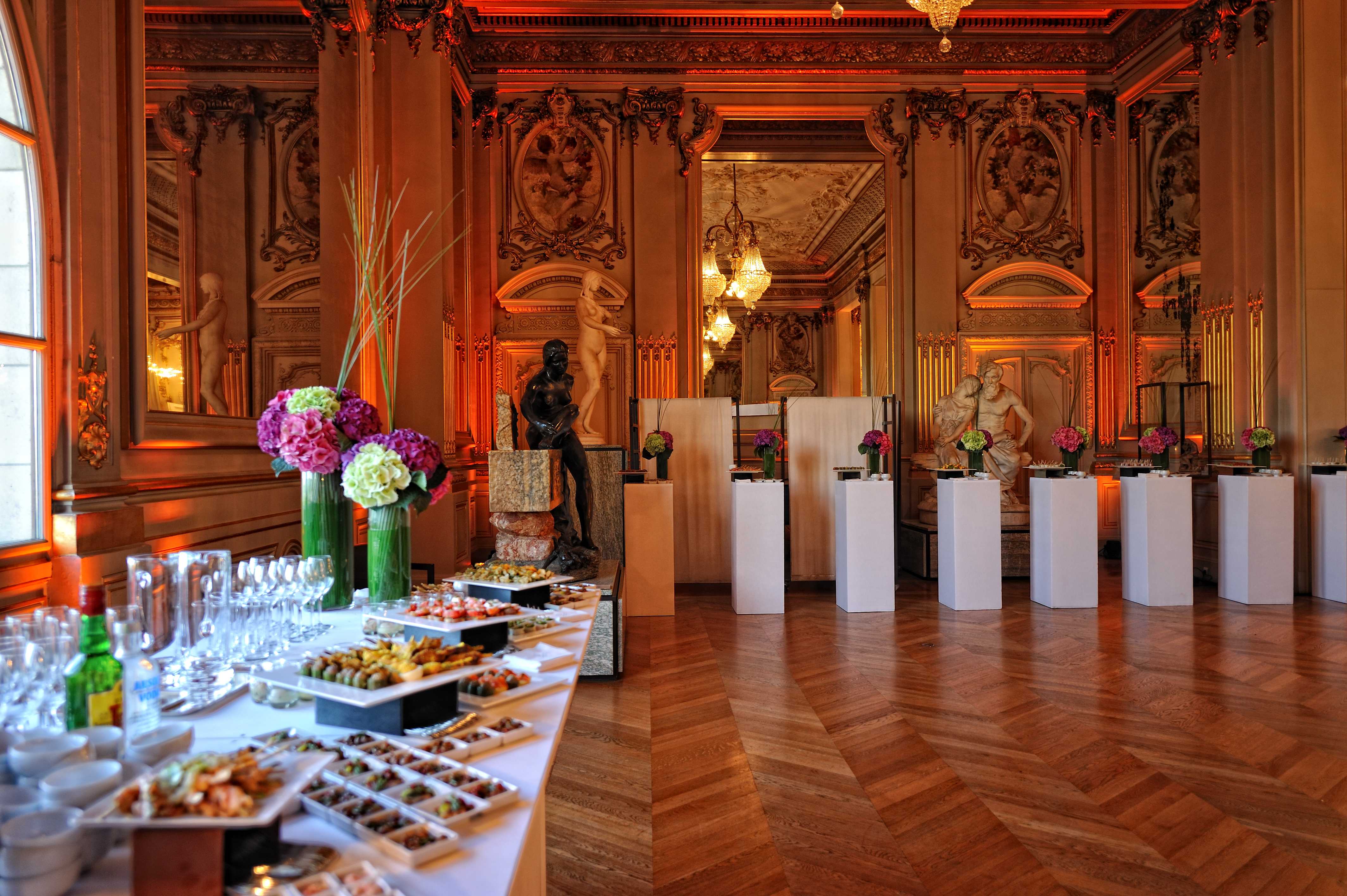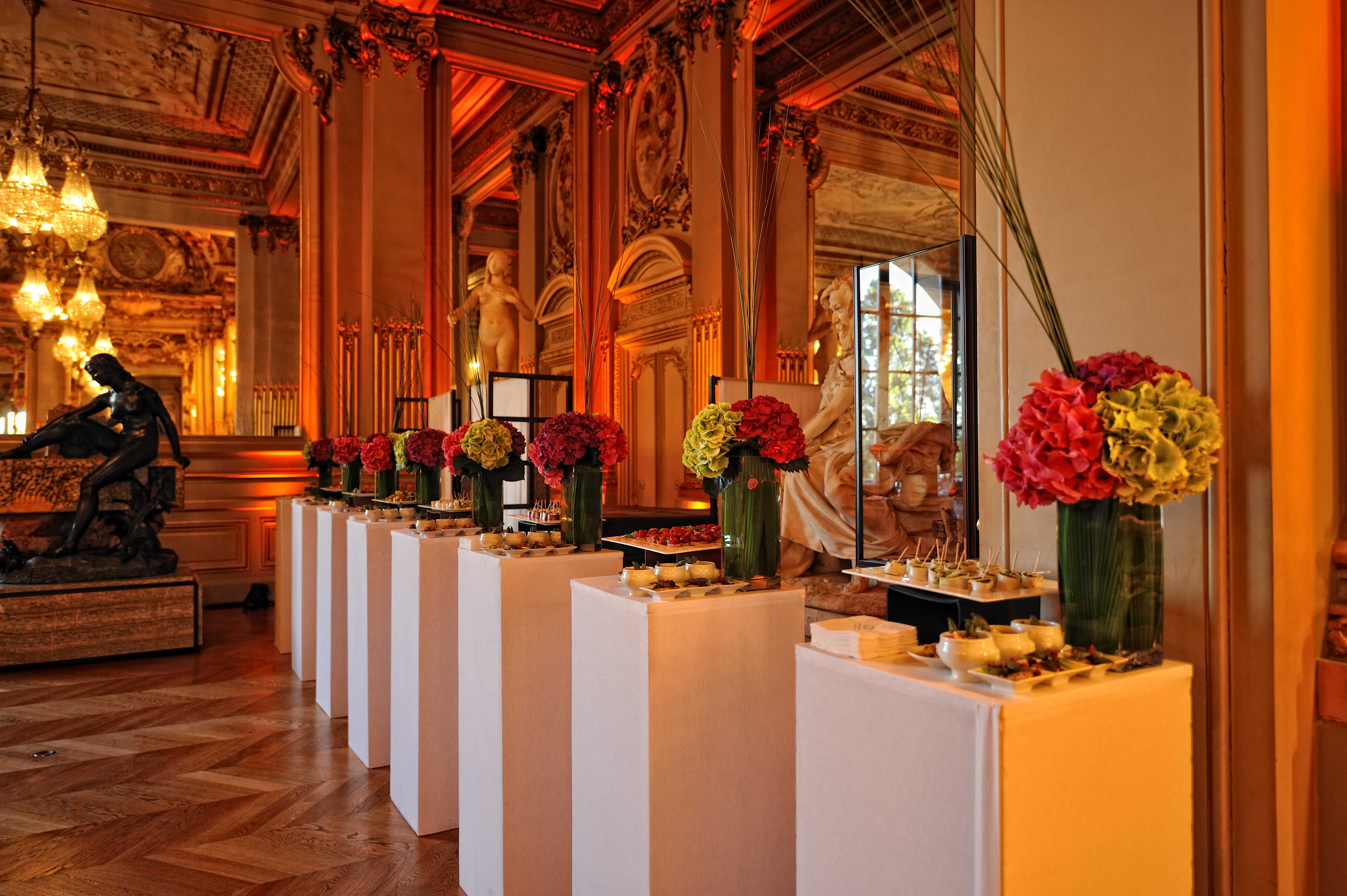 Cocktail dînatoire au Musée d’Orsay après la visite privative d’une exposition. Mise en place, création de décors, mise en lumière, décoration florale, traiteur.